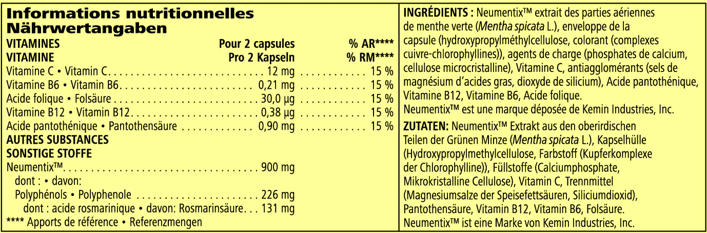 - Active Mind Complex wurde fachkundig entwickelt und enthält einen patentierten Extrakt der Grünen Minze – ein wissenschaftlich geprüfter Inhaltsstoff, der eine einzigartige Kombination natürlich gewonnener Polyphenole einschließlich Rosmarinextrakt enthält.