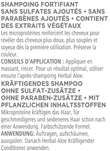 Auftragen, aufschäumen, ausspülen. Für optimale Pflege empfehlen wir, anschliessend Herbal Aloe Kräftigender Conditioner zu verwenden.
