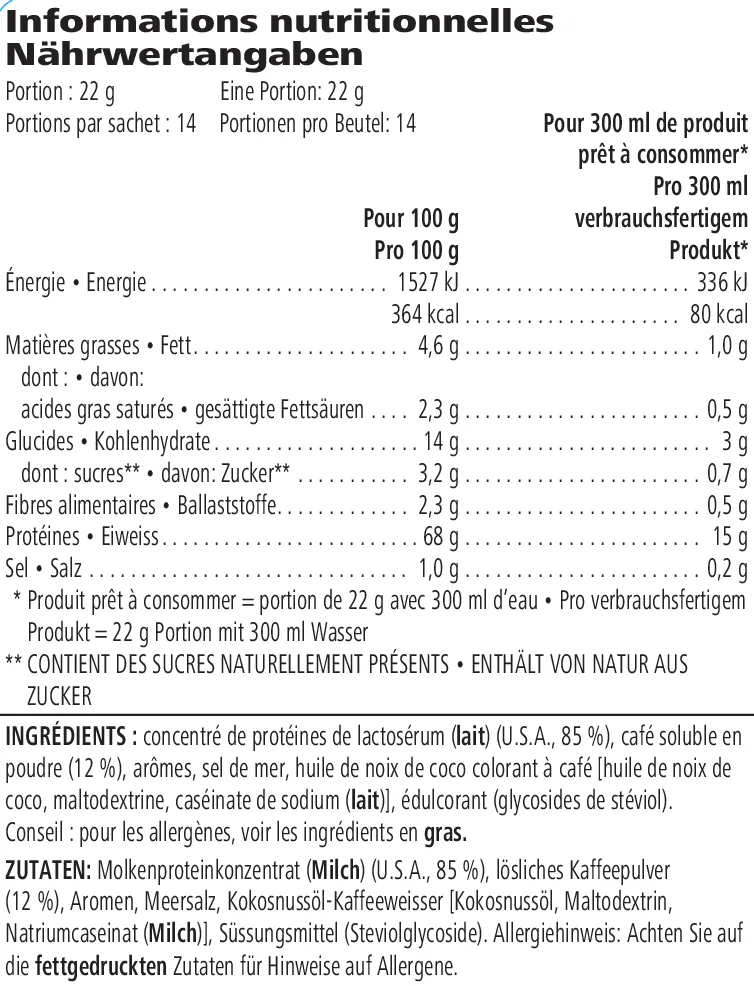 Geniesse unseren erfrischenden High Protein Iced Coffee – egal ob du unterwegs bist oder nur einen Koffein-Boost zwischendurch benötigst! Fachkundig hergestellt aus 100 % Robusta Espressobohnen, liefert er dir 15 g Molkenprotein.* Ohne Zuckerzusatz, Farb- und Konservierungsstoffe und nur 80 kcal pro Portion. Einfach kaltes Wasser und Eis hinzufügen und geniessen!