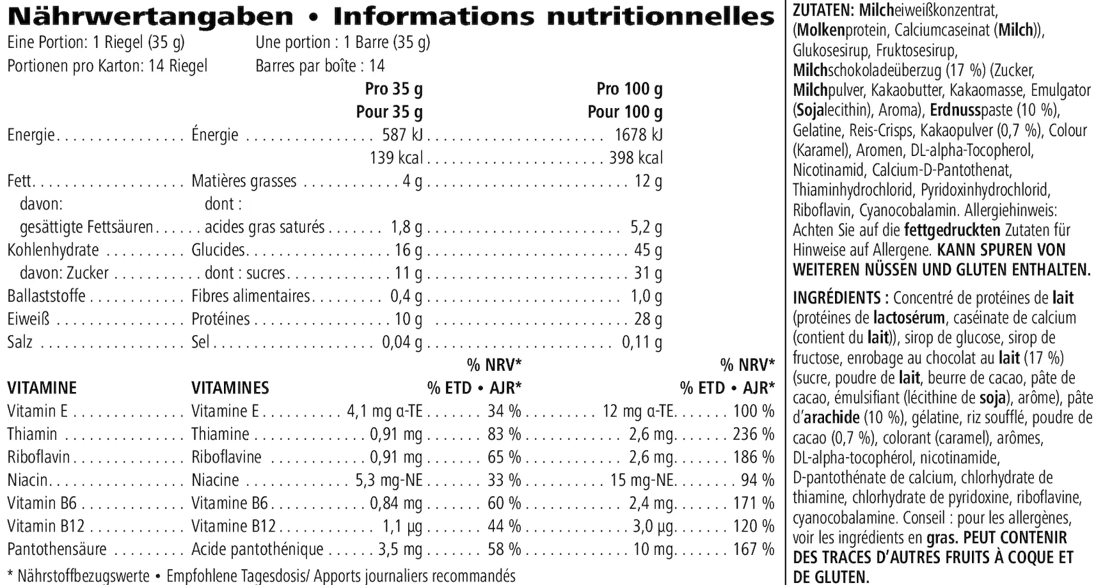 Du bist eine Naschkatze? Besiege deine Gier auf Schokolade mit einem köstlichen, proteinreichen Snack. Diese nahrhafte Leckerei kannst du auch vor oder nach dem Sport zu dir nehmen. Jeder Riegel enthält Proteine und Kohlenhydrate sowie B-Vitamine (B6 und B12), die zu einem normalen Energiestoffwechsel beitragen. Mit 139 Kalorien ist dieser köstlich schmeckende, gesunde Snack ein idealer Proteinlieferant für zwischendurch.