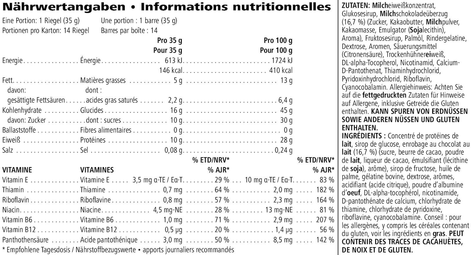 Du bist eine Naschkatze? Besiege deine Gier auf Schokolade mit einem köstlichen, proteinreichen Snack. Diese nahrhafte Leckerei kannst du auch vor oder nach dem Sport zu dir nehmen. Jeder Riegel enthält Proteine und Kohlenhydrate sowie B-Vitamine (B6 und B12), die zu einem normalen Energiestoffwechsel beitragen. Mit 146 Kalorien ist dieser köstlich schmeckende, gesunde Snack ein idealer Proteinlieferant für zwischendurch.