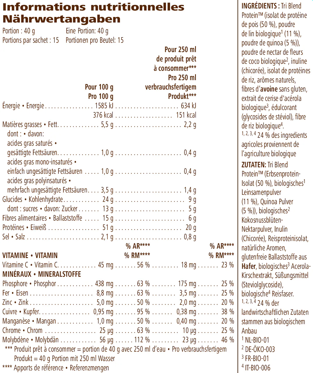 Vor Gebrauch den Beutel vorsichtig schütteln, da sich der Inhalt absetzen kann. Mische 3 Messlöffel (40 g) Pulver mit 250 ml Wasser, deinem bevorzugten Pflanzendrink oder mit Fruchtsaft. Die Flüssigkeitsmenge entsprechend der gewünschten Konsistenz anpassen.*