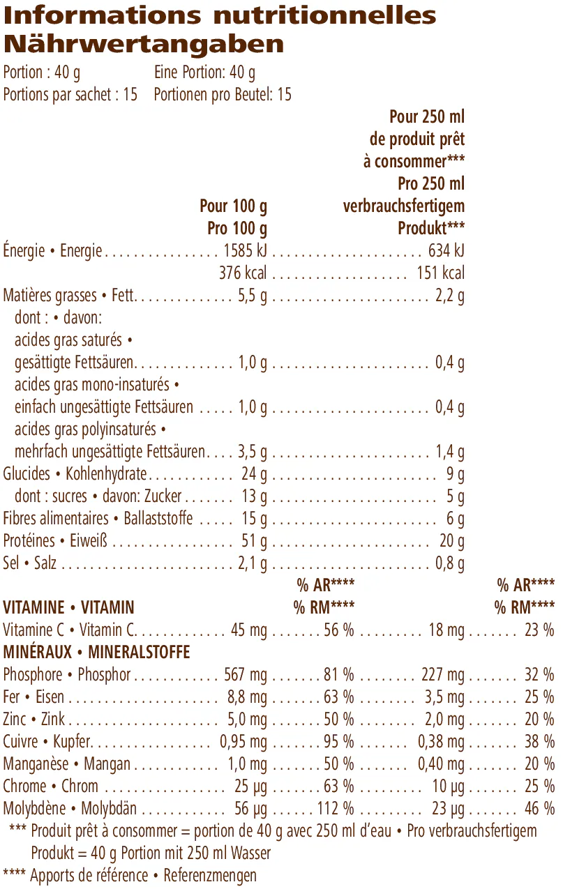 * Andere Nährwertangaben bei Zubereitung mit Fruchtsaft, anderen Getränken oder bei Anpassung der Flüssigkeitsmenge.