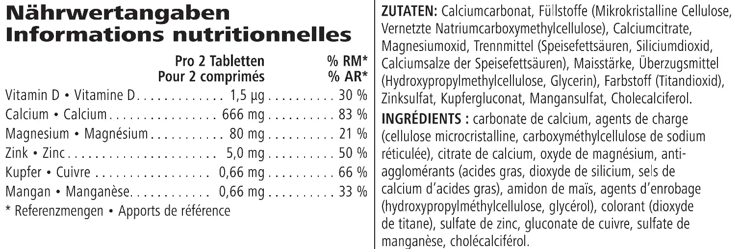 • Enthält 83 % der Referenzmenge an Calcium pro Tag (oder pro zwei Tabletten) und Vitamin D, welches zur normalen Aufnahme von Calcium und zur Erhaltung einer normalen Muskelfunktion beiträgt